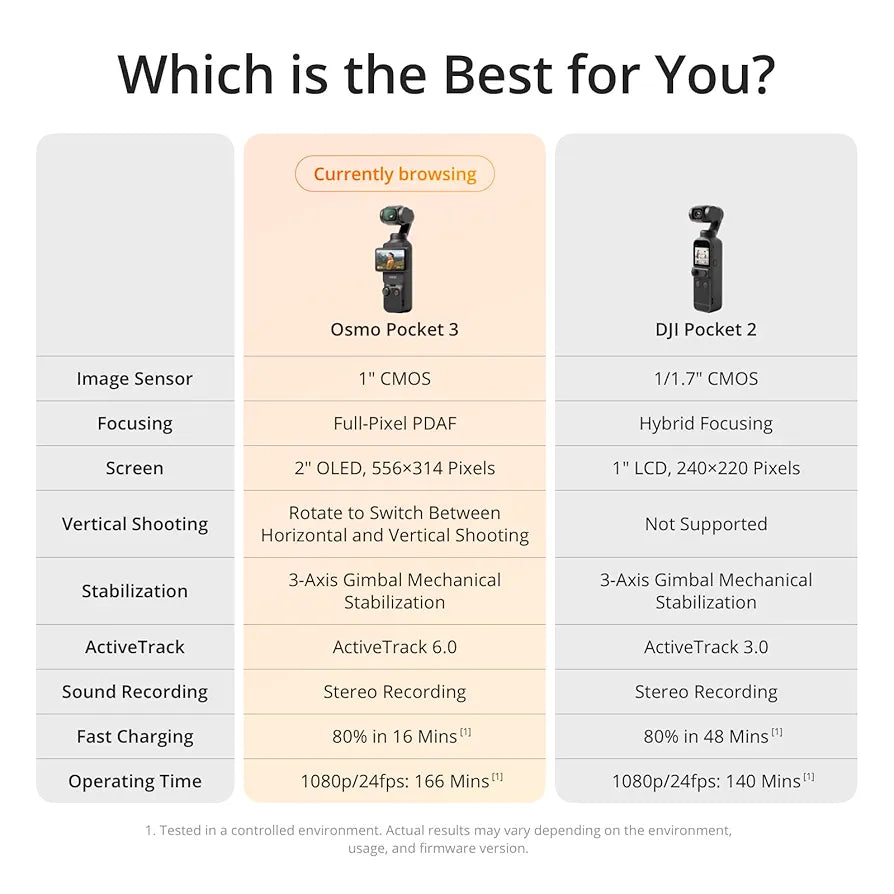 - Ultra-Steady Footage - Say goodbye to shaky videos. Osmo Pocket 3's advanced 3-axis mechanical stabilization delivers superb stability. Enjoy smooth footage while dancing, chasing pets, or vlogging.